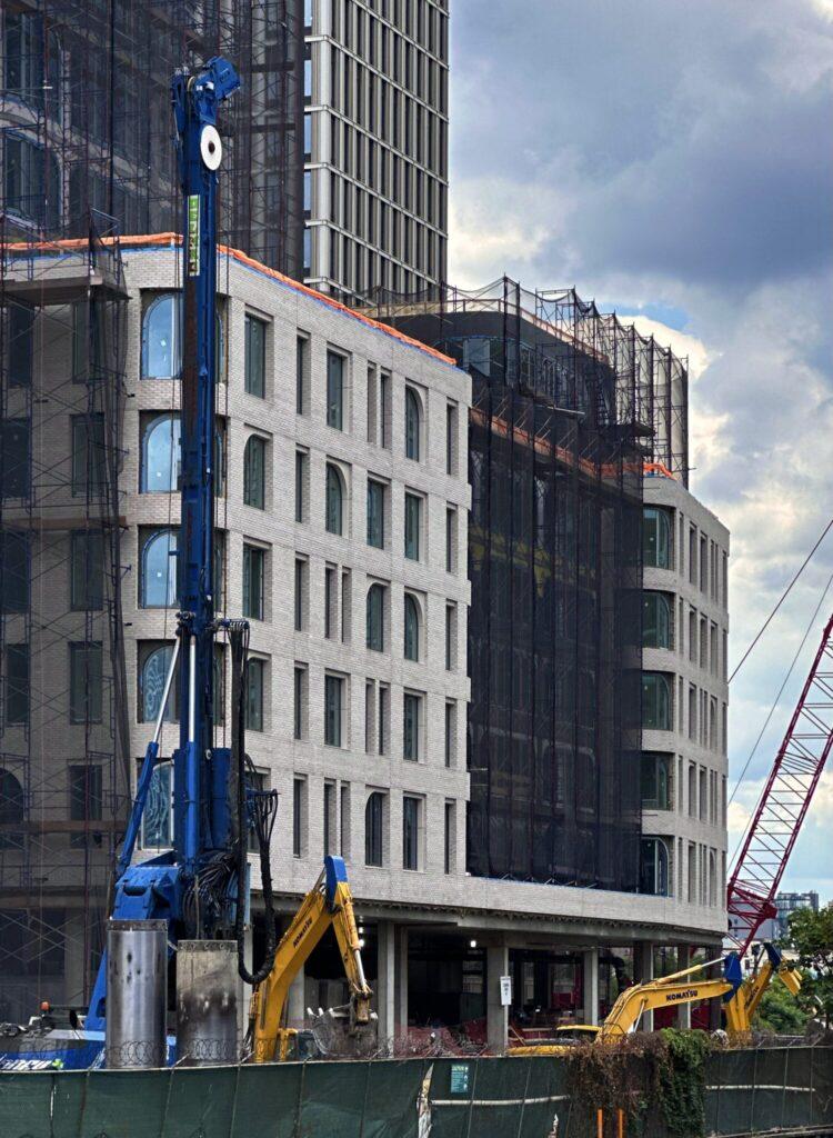 Since topping out earlier this year, the project has shifted focus to exterior work. Nevins Landing South, the shorter of the two towers, is now wrapped in floor-to-ceiling windows, partially concealed by scaffolding and netting. Its podium is nearly fully clad in light gray brick, with scaffolding starting to come down along the waterfront edge.